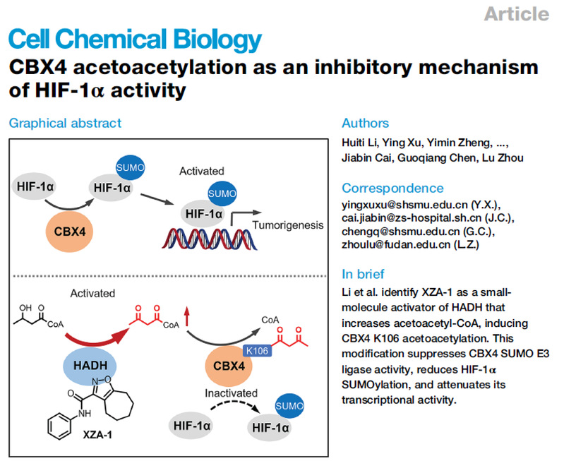 近日,复旦大学药学院周璐教授课题组联合陈国强院士及樊嘉院士/蔡加彬副主任医师团队发现了一种调控HIF-1α转录活性的新机制,相关工作以“CBX4 acetoacetylation as an inhibitory mechanism of HIF-1α activity”为题在线发表于Cell Chemical Biology杂志。