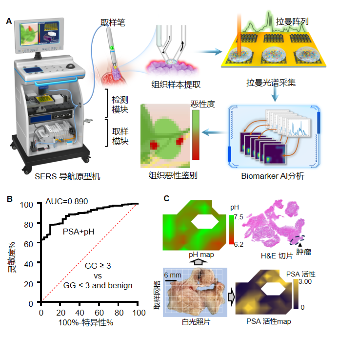 图1.免标记拉曼导航系统术中实现前列腺癌恶性分级。(A)手术导航系统工作流程示意图。(B)术中检测组织间液酸化(pH)和前列腺特征抗原(PSA)活性双分子标志物定位GG≥3前列腺癌组织的受试者操作特征曲线。(C)病人前列腺组织白光照片、H&E染色切片与pH和PSA活性分布图。