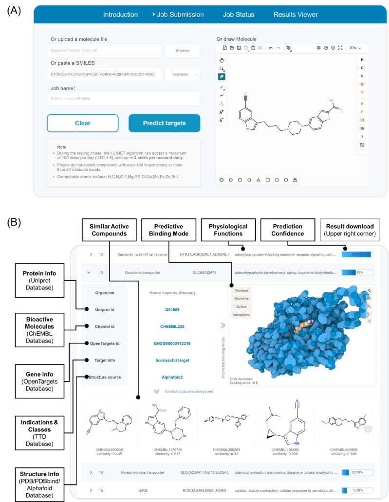 图3:以维拉佐酮作为查询分子的案例研究。(A)查询界面支持多种输入模式;(B)结果展示界面,包括多种基本信息、预测证据和基于分子对接的结合模式。