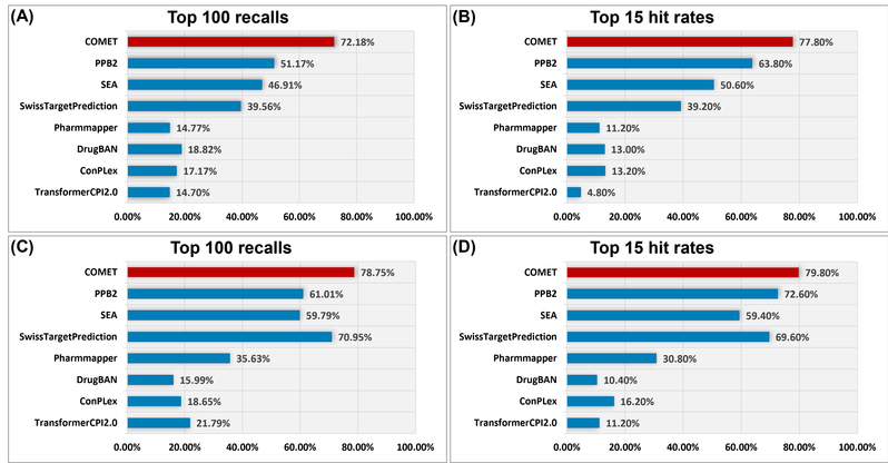图2:COMET和其他7种靶点预测方法的性能对比结果。(A,B)在ChEMBL33测试集上的结果;(C,D)在BindingDB测试集上的结果。