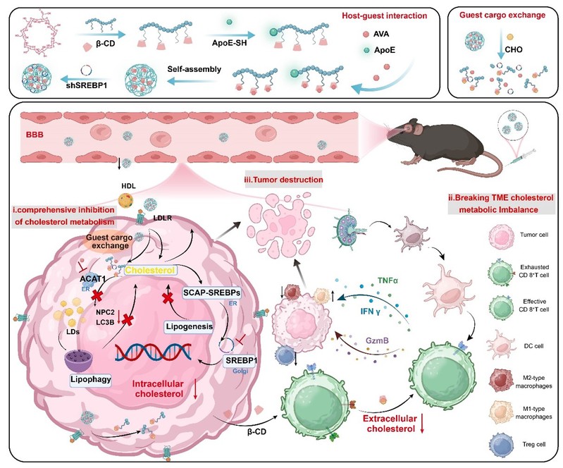 针对胶质瘤胆固醇代谢重编程和严格的血脑屏障特征,研究团队基于β-CD和胆固醇的天然亲和力构建了一种肿瘤原位触发“客体交换”-调控胶质瘤胆固醇代谢失调的超分子纳米清除剂。通过对β-CD进行亲水改造,疏水性药物分子avasimibe提前占据β-CD空腔形成纳米清除剂,并在其表面修饰能主动靶向和结合于血脑屏障和肿瘤细胞高表达的LDLR受体的功能元件ApoE多肽,赋予纳米清除剂穿越血脑屏障,靶向肿瘤微环境并在病灶部位蓄积的能力。在胶质瘤“富胆固醇”微环境中,通过主-客体间亲和力的差异,实现了荷载药物的释放和胆固醇的清除,进而实现了干扰肿瘤细胞胆固醇稳态的目的。此外,β-CD发挥载体-清除剂的双重功能,β-CD释放药物后在微环境中进一步与胆固醇结合形成胆固醇-环糊精复合物,这种结合行为有利于发挥清除微环境富余胆固醇,减少CD8+T细胞耗竭,抑制性巨噬细胞和调节性T细胞浸润,重塑免疫抑制性微环境,实现多角度调控胆固醇代谢治疗胶质瘤的目的。