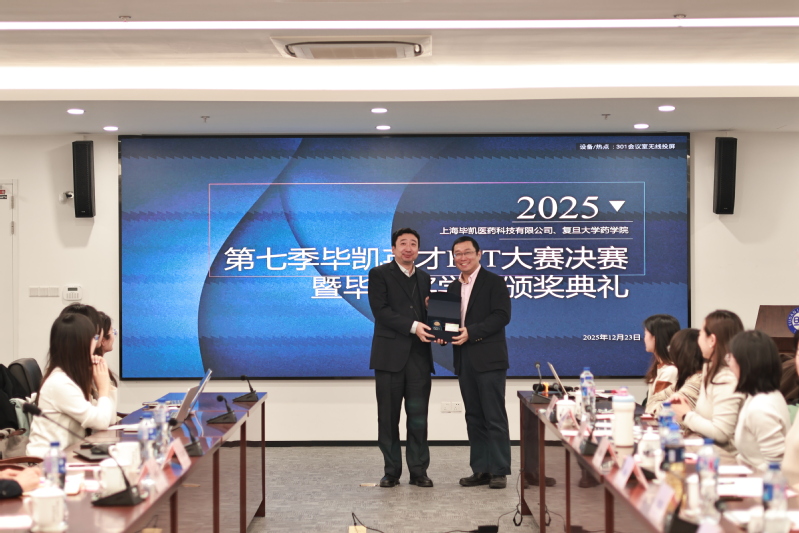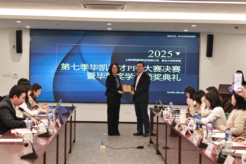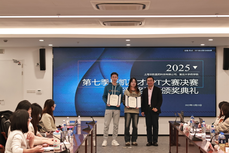 2025年12月23日下午,由复旦大学药学院与上海毕凯医药科技有限公司联合举办的第七季毕凯英才PPT大赛决赛暨毕凯奖学金颁奖典礼于3号科研楼301会议室成功举行。上海毕凯医药科技有限公司总经理、药学院97级校友杨景瑞,药学院党委副书记史雪茹、王盛,上海毕凯医药科技有限公司资深编辑刘瑛瑛、陈俊华、徐鹏、陈惠卿出席本次活动。活动由药学院2025级硕士研究生覃敏妮主持。