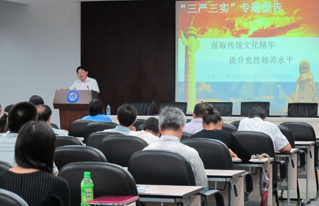 为深入学习贯彻落实“三严三实”,加强党员干部自身修养,2015年9月16日下午,药学院党委邀请中共上海市委讲师团首批成员、上海市委党校陈方刘副教授在张江校区行政楼106报告厅作了一场名为《汲取传统文化精华,提升党性修养水平》的专题报告。报告由药学院党委宣传委员张雪梅教授主持,药学院全体教职工党员、教研室主任和学生支部委员以及张江管委会的老师参加了报告会。