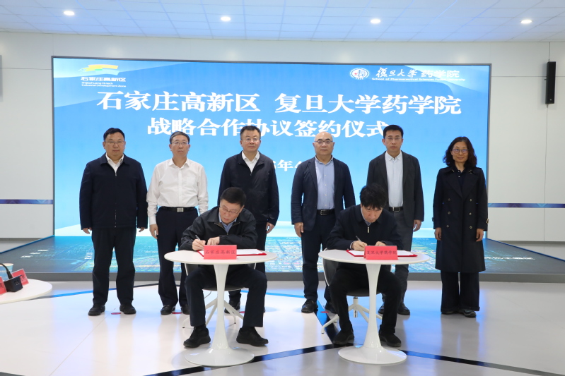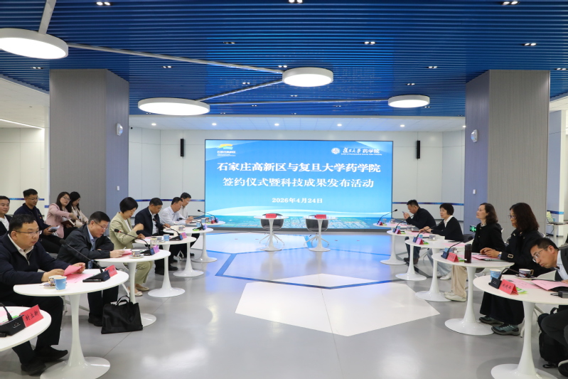 4月24日,复旦大学药学院党委书记王建新一行赴河北石家庄高新区考察调研。双方在石家庄市国际生物医药园举行战略合作签约仪式暨科技成果发布活动。河北省药品监督管理局副局长李挥、石家庄高新区管委会主任赵路新、常务副主任封立新出席活动,高新区科学技术局局长曹凤梅主持会议。复旦大学药学院专家教授,高新区区直各部门及重点生物医药企业家、金融机构代表共计50余人参加活动。